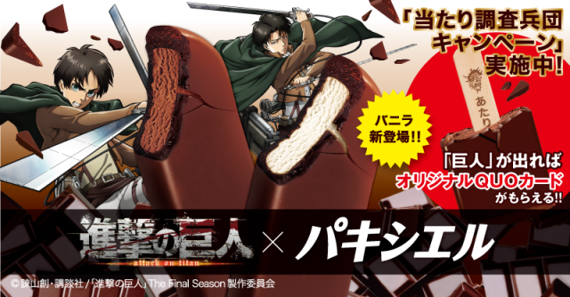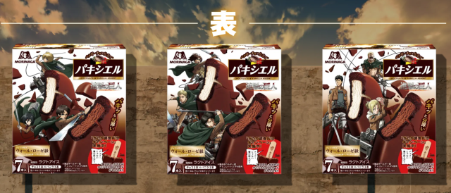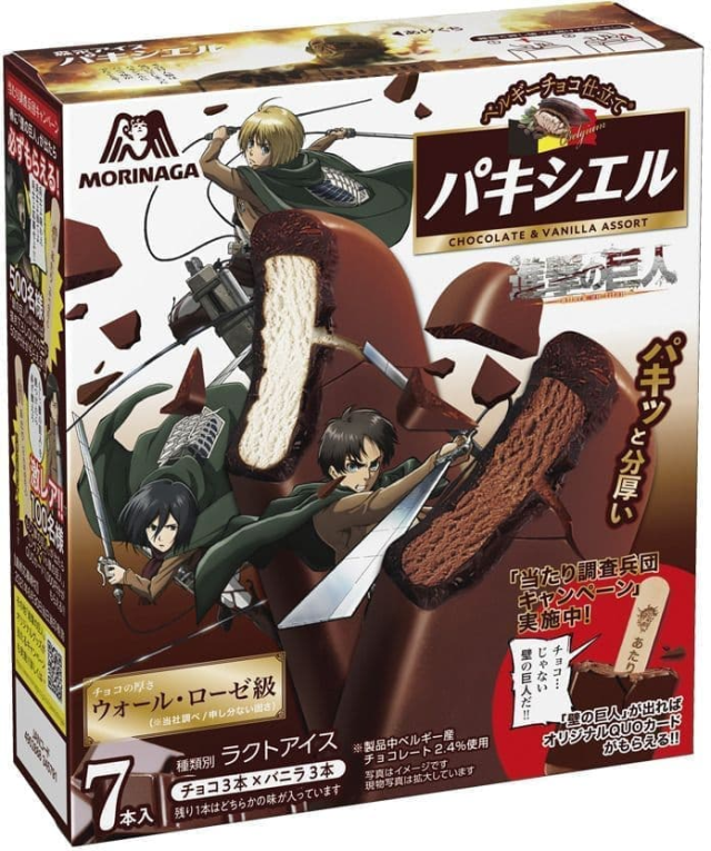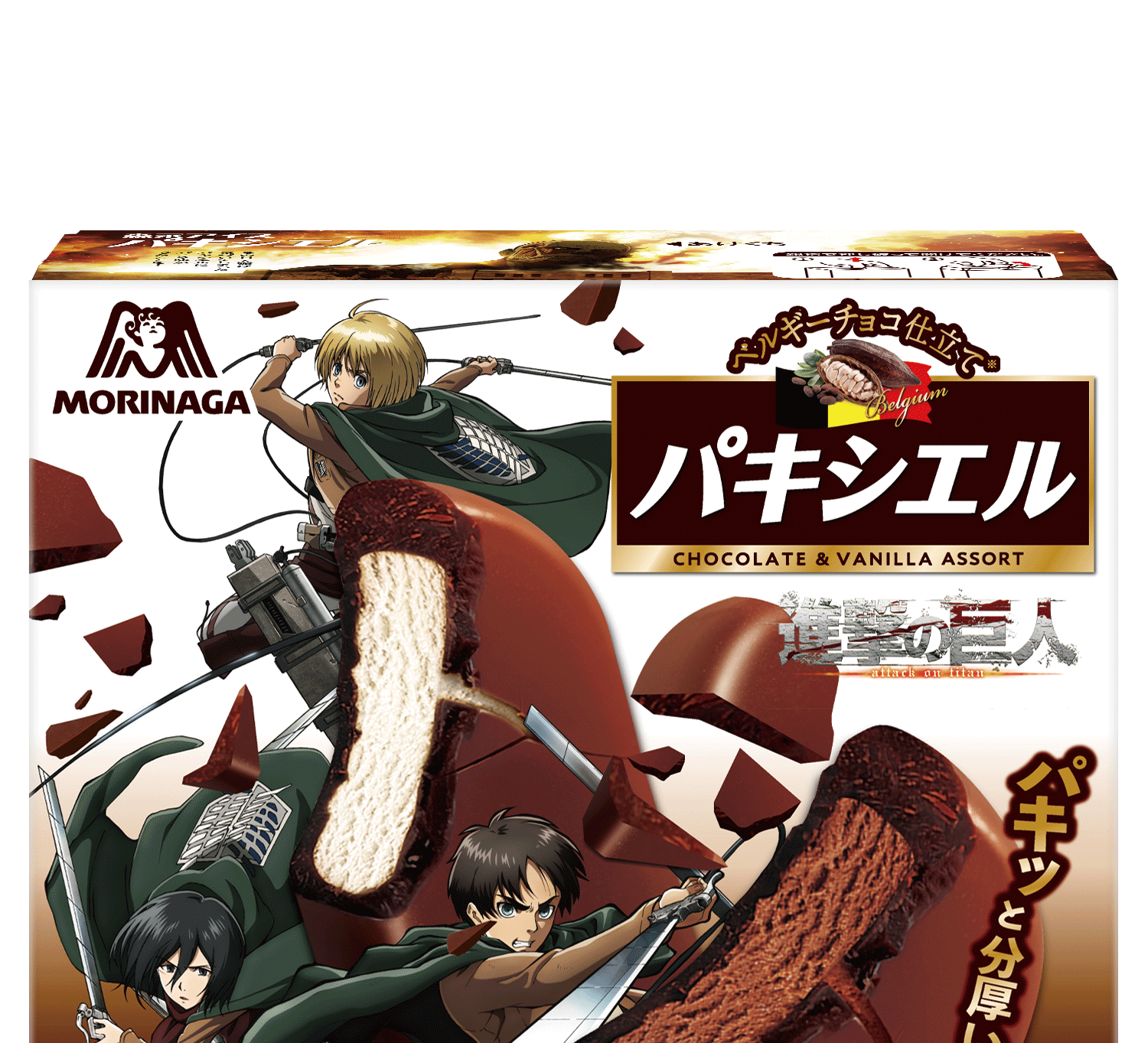 森永製菓旗下的巧克力冰棒「パキシエル」與日本人氣動漫《進擊的巨人》合作,推出聯名的包裝樣式,並且推出充滿趣味的抽獎活動,讓每一個在炎炎夏日享用冰棒的消費者能夠體驗抽獎的趣味。