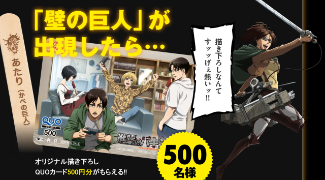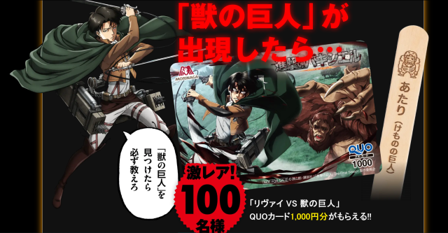 這次與《進擊的巨人》合作,活動非常的復古 XD,只要在吃完冰棒後,看到木棒有顯示中獎,就有機會獲得「進擊的巨人聯名 QUO 卡」,分別有兩種款式。QUO卡 是一張全日本通用的商品券(預付卡),在便利商店、書店、藥妝店、家庭式餐館以及加油站等全日本各大 QUO 卡加盟店都可使用。