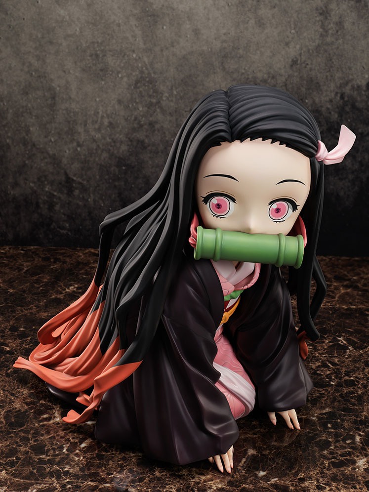 F:NEX「箱子裡的縮小禰豆子」雕像,尺寸約高 44 公分,大尺寸再現劇中將自己身體縮小、鑽入木箱的跪坐姿態小禰豆子可愛樣貌!咬著竹筒無辜的表情、嬌小的身軀,以及身體縮小後的寬鬆的衣服超萌造型!通過精緻的造型和塗裝表現出皮膚柔軟的質感,頭髮光澤與變色髮尾也生動還原;飄逸的長髮和麻葉紋羽織等細節都精美呈現!
