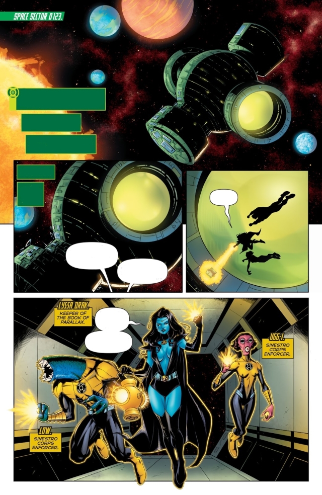 來到了 0123 扇區,以恐懼為黃燈為力量來源的辛納托軍團(Sinestro Corps)有三位成員抵達看似廢棄實則用作通訊樞紐的綠燈軍團衛星站,他們是百烈剎之書(The Book of Parallax)的管理者麗莎‧德拉克(Lyssa Drak)與兩位辛納托軍團執法者,意圖抹殺駐守在此衛星站的綠燈戰警,好使辛納托軍團能全面掌握 0123 扇區。