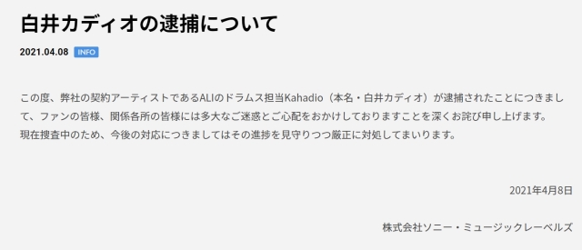 這個消息為 ALI 的官方網站上發表的已認證情報,但文中並未提到是因為什麼罪而被逮捕。但因為此事,預定於明日 4 月 9 日播出的本季新番《這個美妙的世界 The Animation》原訂將會使用 ALI 的新曲「TEENAGE CITY RIOT」當作OP主題曲,將會臨時變更主題曲的部分,這也讓許多粉絲不能聽到 ALI 的新曲而感到失望。