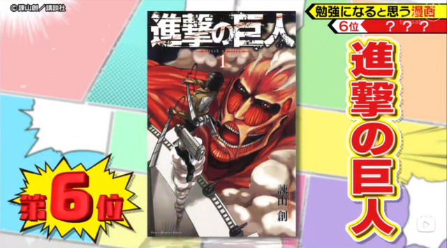 在節目中,製作單位邀請了500名東京大學的學生,投票選出自己認為最具有教育性質的漫畫,其中《進擊的巨人》就以排名第6的位置,進入了此次的排行名單之中。