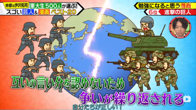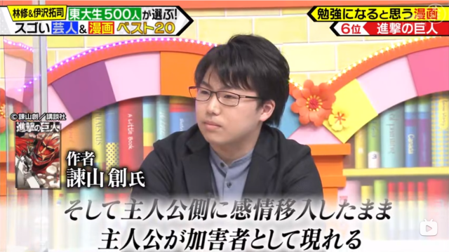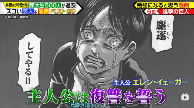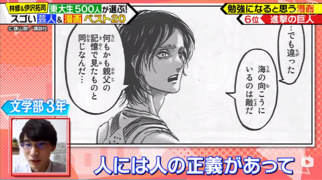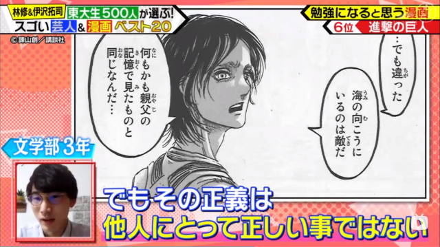 事實上早在2021年2月時,日本綜藝節目《林修の今でしょ!講座》,就曾以「最具有教育意義的漫畫排行」,提到了關於諫山創老師對於《進擊的巨人》最真實的創作理念。