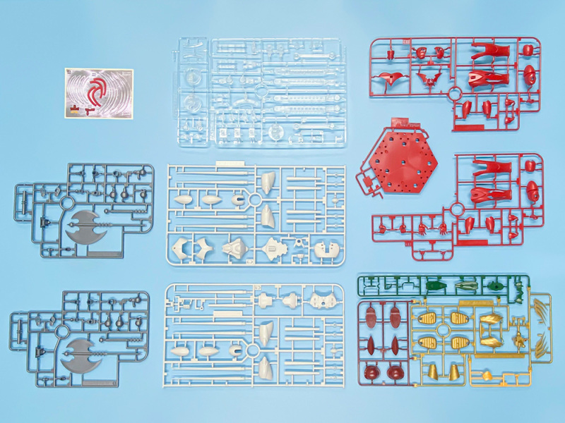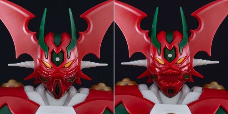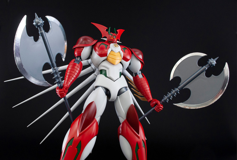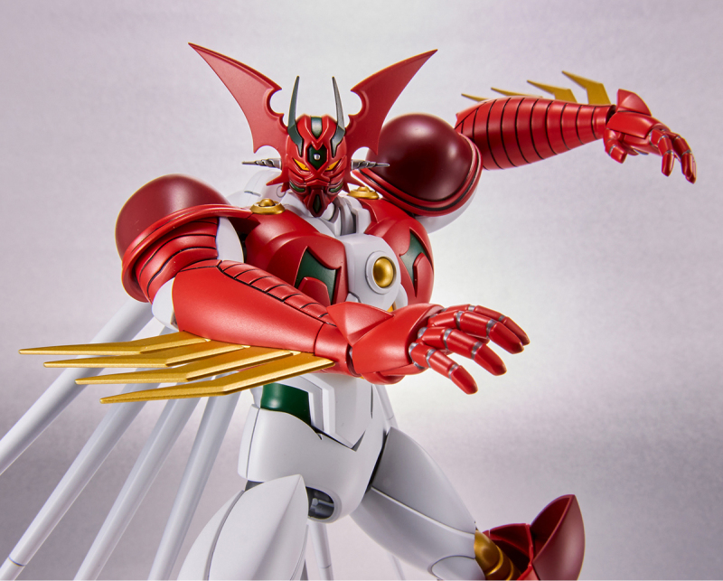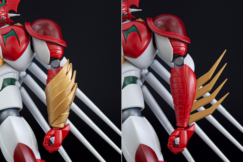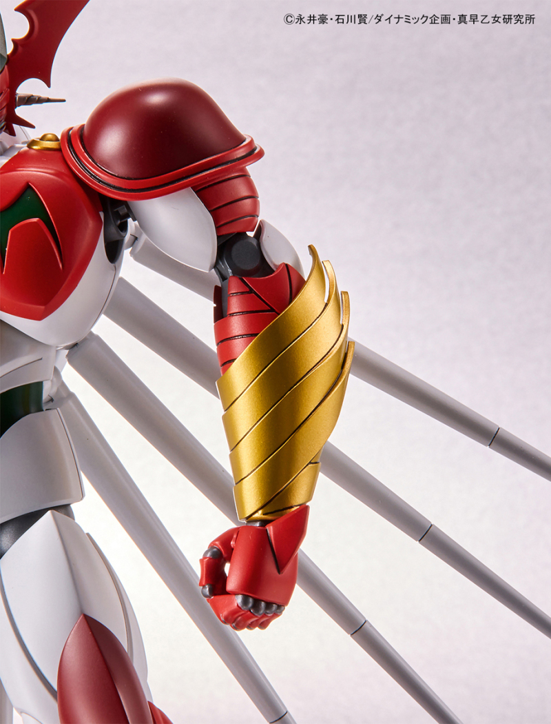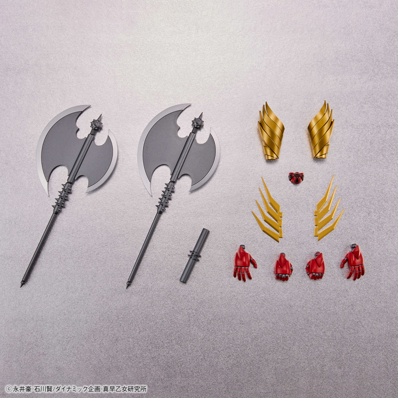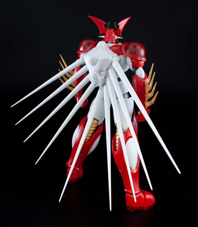 背部搭載的 9 根翅膀基部為獨立可動機構,將背包反轉後即可再現施展必殺技「雷霆爆破」時的姿態!而兩把尺寸具備相當份量的主武裝「蓋特戰斧」則刻畫出精密的細部造型,更有連結兩把戰斧的用零件,能夠重現劇中各種魄力的戰鬥姿態!