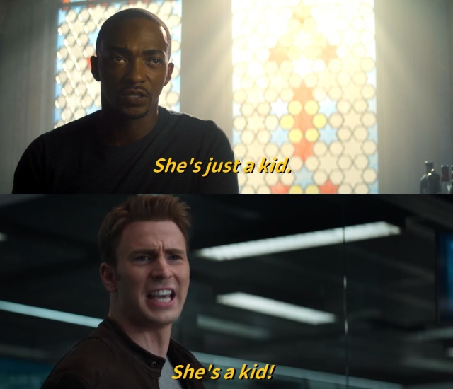 澤莫想以極端手段處理卡莉,山姆就說她只是個孩子。類似的對話也出現在《英雄內戰》中,史塔克將汪達軟禁在聯盟總部的方式,讓當時的史帝夫聽了大罵史塔克。
