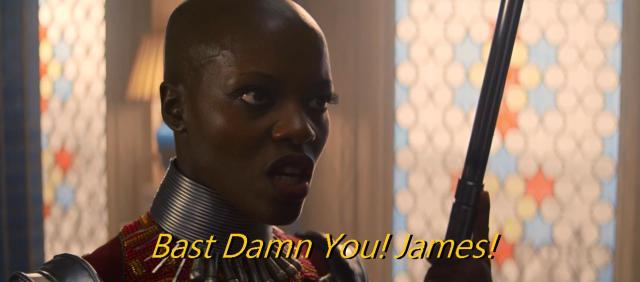 時限截止,朵拉護衛隊前來緝拿澤莫,卻引起一場大混戰。艾尤三兩下「點穴」將巴奇的汎金屬手臂拿下,並且留下了一句「Bast Damn You! James」Bast 就是《黑豹》中提到瓦干達的豹神巴斯特,所以這句話其實就是「God Damn You!」的瓦干達語版。
