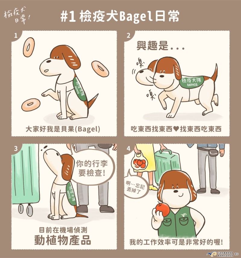 為宣導動植物防疫、防範疫病害蟲入侵的重要,行政院農委會動植物防疫檢疫局-防疫小尖兵粉絲團推出《檢疫犬貝果日常》連載插畫故事,以四格漫畫記錄著護國神犬貝果的工作,並透過貝果的視角提醒國人、旅客入境行李中攜帶之農畜產品的相關規定與注意事項。