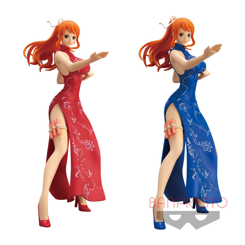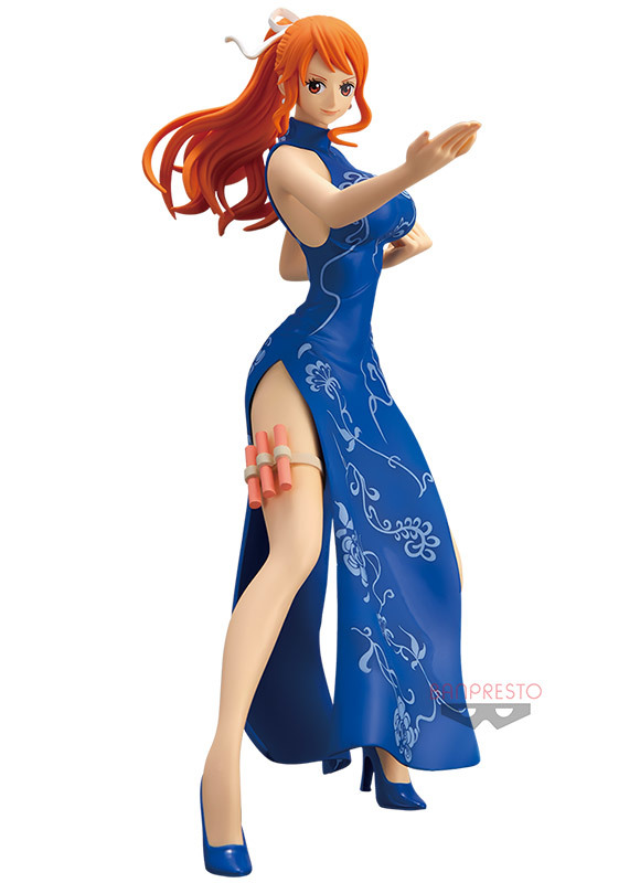 這次的「娜美」換上了開高叉的貼身中式旗袍與高跟鞋,擺出雙腿微彎、雙手分別是握拳與手刀的功夫架勢,除了維持著一貫的細緻臉蛋與凹凸有致的不科學身材之外,在空中飛舞的橘色長髮也有生動的形塑,旗袍上還有漂亮的紋路刻畫,右大腿外側則設置了固定招牌武器「天候棒」的棍套,值得一提的是,這邊天候棒的顏色是選用早期漫畫設定中的紅色,而不是動畫裡的水藍色;另外,本作也同步推出了紅色旗袍、藍色旗袍兩種版本可以購買喔。