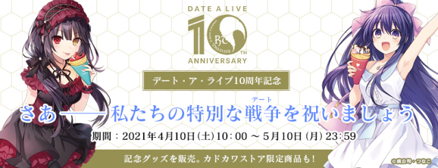 今年 3 月 19 日為人氣輕小說作品《約會大作戰 DATE A LIVE》邁入 10 周年,先前官方也預告將有周年企劃活動的資訊。在 4 月 10 日時宣布了將在角川線上商城舉辦 10 周年活動,將有抽獎&大量周邊販售。原著繪師つなこ也繪製了 10 周年的賀圖,由兩大人氣角色-夜刀神十香&時崎狂三穿著私服到遊樂園遊玩的形象呈現。 10 周年活動期間為 2021 年 4 月 10 日~5 月 10 日止。