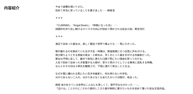 劇作家麻枝准繼《成神之日》後不是推行動畫,而是撰寫小說撤換跑道,本次由Key社預告麻枝准的處女小說《猫狩り族の長》情報,劇情描述被貓嫌棄的天才作曲人和孤身一人的大學生相遇的故事,因自殺前往海岸而有所交集,並在六天內講述他們的心路歷程。