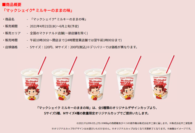 麥當勞×不二家聯名奶昔「マックシェイク® ミルキーのままの味」售價分別為小杯120日圓與中杯200日圓(含稅),冰淇淋的部分則為250日圓(含稅),活動期間將從2021年4月21日開始,一直到2021年6月上旬結束。