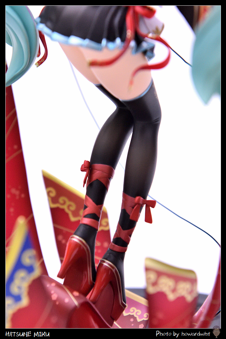 大腿上的圖案與旗袍上的圖案剛好相互輝印,在配上紅緞帶與紅底金邊高跟,多了份中式喜氣