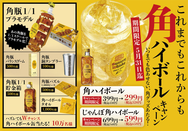 販售眾多啤酒、洋酒、軟性飲料的日本三得利株式會社(サントリー)與大眾居酒屋「ミライザカ」日前開始舉辦了期限到 2021 年 5 月 31 日的「角HIGHBALL Campaign」(角ハイボール キャンペーン)活動!除了有角HIGHBALL 系列飲料的減價優惠、希望可以刺激消費之外,還能夠參加高達 5,600 個獎項的應募活動!