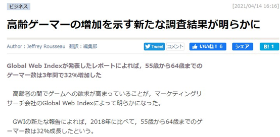 Global Web Index對於遊戲受眾行資料收集,從多個地區採樣近2萬人,發現越來越多老年人加入「遊戲玩家」的行列,其中以55歲~65歲的高齡區間最為顯著,3年成長32%。