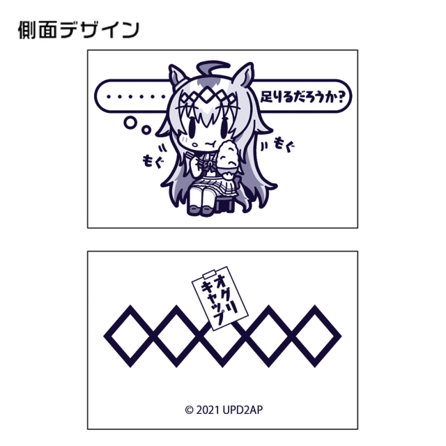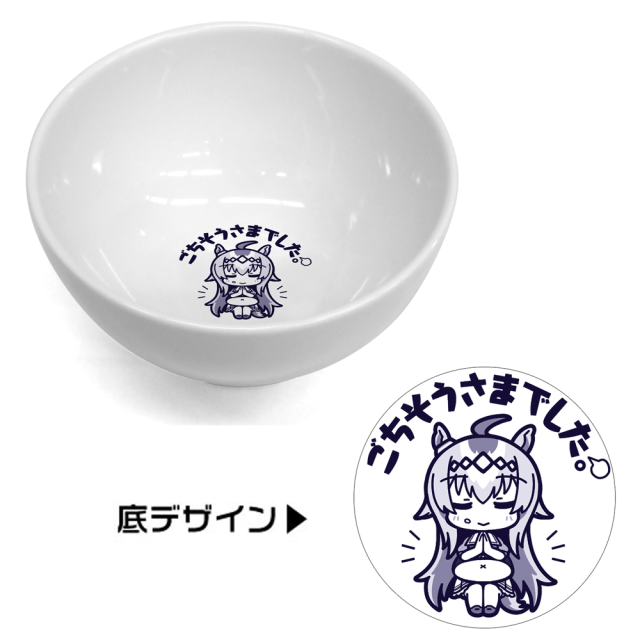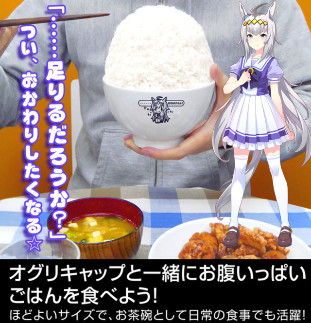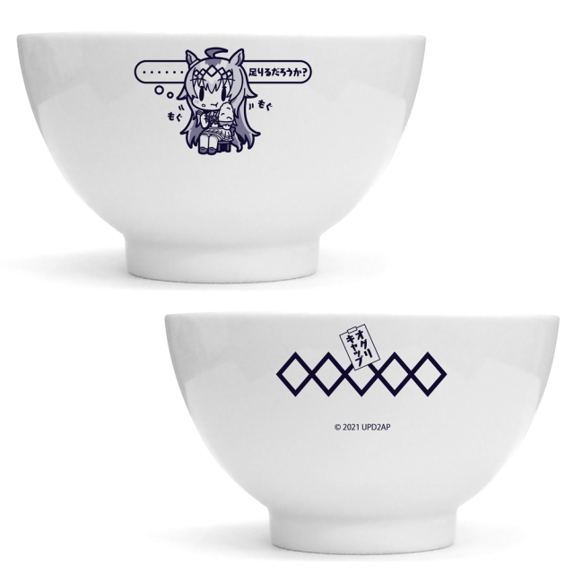 碗側邊也有圖案配置,有著 Q 版的小栗帽邊吃邊喊「……足りるだろうか?」( 這樣吃夠嗎? ) 超可愛的模樣,另一側則有小栗帽的本名 オグリキャップ 。