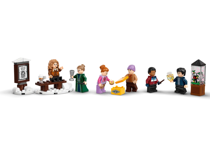 這次的活米村盒組主打「蜂蜜公爵糖果店(Honeydukes Sweetshop)」跟「三根掃帚(Three Broomsticks)酒吧」這兩棟建築,除了小而美的內裝之外,人偶部分也頗為豐富,包含哈利、丁·湯馬斯(Dean Thomas)、麥米奈娃教授、羅梅塔夫人(Madam Rosmerta),以及弗魯姆(Flume)先生、弗魯姆太太;金色人偶是榮恩·衛斯理、巫師卡則附上四片。