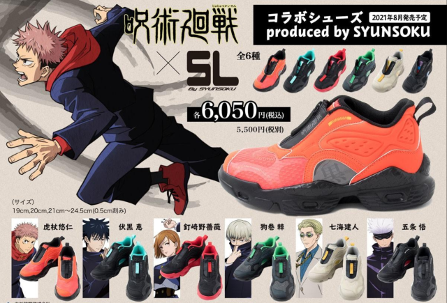 日本漫畫家芥見下下的漫畫作品《咒術迴戰》,為 2018 年開始在《週刊少年JUMP》連載,動畫第二季也播放完畢,未來將播映劇場版,人氣持續高漲。近期宣布與日本本土品牌「SYUNSOKU瞬足」合作,推出聯名球鞋,以小學生為市場,推出孩童的Size 給喜歡咒術迴戰的小朋友。共計六款鞋款,售價為 6,050 日圓。