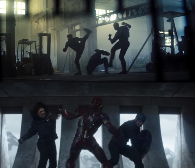 山姆和巴奇隨後也跟到了車庫,試圖說服約翰交出盾牌,兩方人馬開始大打出手。還原了《美國隊長:英雄內戰》最終史塔克、史蒂夫和巴奇的混戰,連配樂都還原了。
