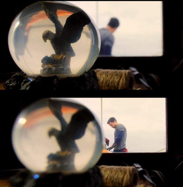 山姆家中有個水晶球裡的塑像,大家可能第一眼以為就是一隻獵鷹,但牠其實是白頭海鵰,又名白頭鷲,是美國的國鳥與象徵之一,也暗示了山姆即將成為美國隊長。畫面構圖刻意將水晶球顯示巴奇的左側,又是在玩「On your left」的梗了。