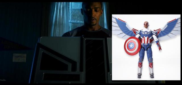 山姆回到家打開巴奇請瓦干達幫忙帶來的「禮物」,雖然漫威賣關子讓我們要到下一集才會看到,但之前孩之寶的玩具可能就已經暴雷,是一款融合美國隊長圖騰的獵鷹服裝。