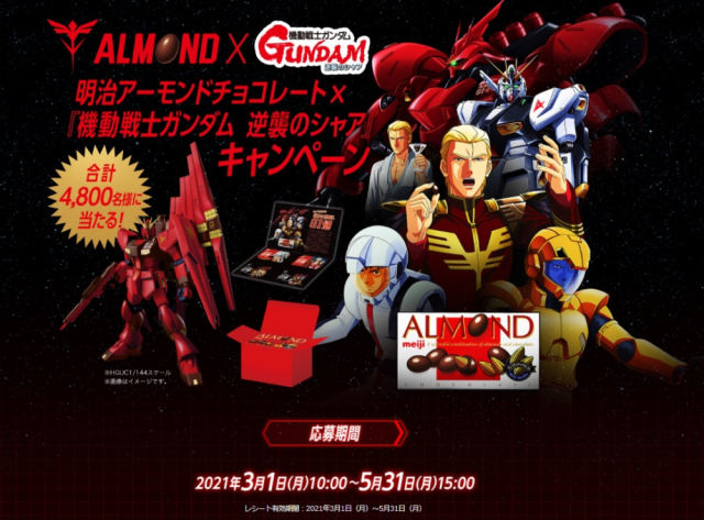 事實上這次合作早在三月就展開了,跟先前相同只要購買指定商品,就有機會抽到「明治杏仁巧克力限定配色 1/144 HGUC ν鋼彈」組裝模型與多項好禮,詳情可見合作官方網站。
