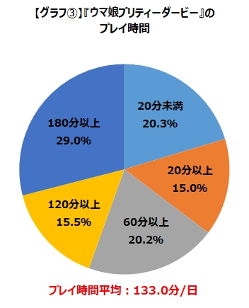 接下來是遊玩時間和手機遊玩的時間佔比,有將近64.7%的玩家花費一小時以上的時間在《賽馬娘》,平均時間高達133分鐘,另外與其他手遊對比,玩家在使用手機的時間裡,《賽馬娘》就佔了總使用時間中的23.2%,遠遠超過第二名的《FGO》,所以說訓練師們真的很可怕。