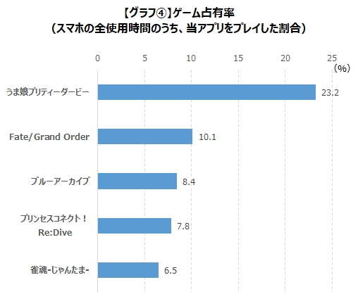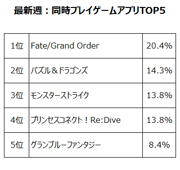 另外,調查的最新週中與《賽馬娘》同時遊玩的手遊中,以《FGO》佔第一,《龍族拼圖》第二,《怪物彈珠》為第三。