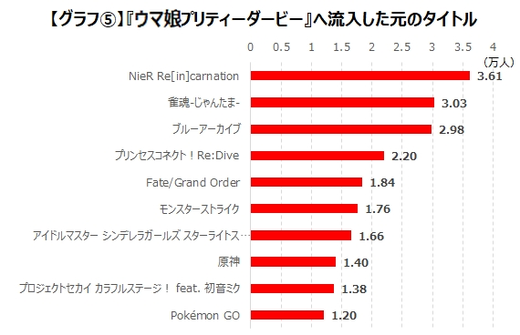 再來還有個調查項目是「流入《賽馬娘》的原手遊作品玩家」,指的是原為該遊戲的玩家群因《賽馬娘》上市後紛紛入坑,其中跳坑最多的是《NieR Re[in]carnation》,多達3.61萬人,其次為《雀魂》3.03萬人,再來是《碧藍檔案》(ブルーアーカイブ)2.98萬人,多少手遊因為這款遊戲橫空出世而流失客群呢...