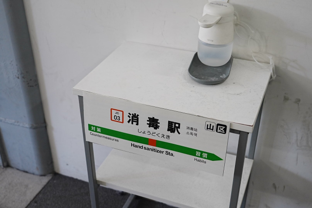 圖片由あすたりすく(@akiba_asterisk)發布,御茶之水站內有一處專門讓路過的人使用消毒水的區域,你可能會好奇「一個消毒區是有什麼好稀奇的?」有人討論自然有它有趣之處,在放置消毒水的桌緣貼了一張標示牌,並寫到「消毒駅」還模仿了日本車站牌的樣式,前一站是「對策」,下一站則是「習慣」。