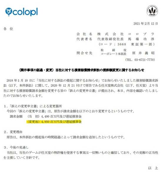 COLOPL的手機遊戲《白貓PROJECT》從2018年開始便被任天堂以玩法與專利侵權等五種理由進行產權訴訟,在今年2月已經從44億提高至49億5千萬日圓,而這段時間任天堂認為訴訟時期過長,法務部又重新評斷賠償合理性,本次將賠償金提高至96億9900萬日元,幾乎翻倍,且訴訟延遲賠償金還要另外計算,目前在4月13日提出變更申請書。
