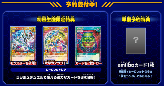 早期預約的話可以獲得隨機獲得一張 amiibo 卡,初回生產限定特典的內容則是最強戰旗王牌破壞者、黑魔導女孩以及強欲之壺的同捆包。