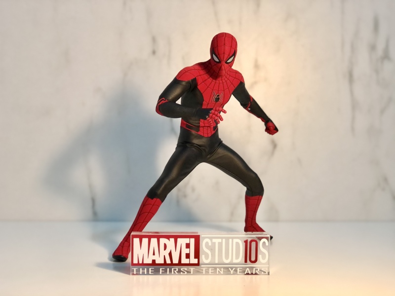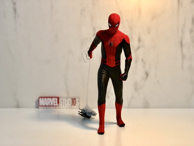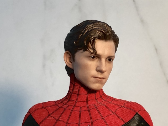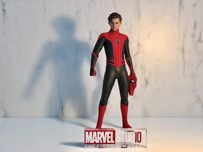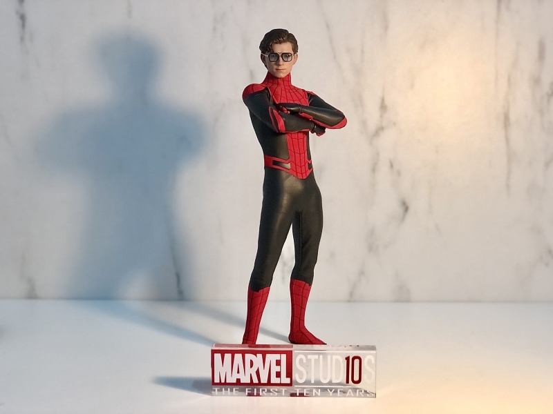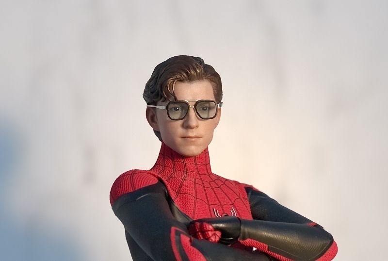 本體基本上是一模一樣,所以可動就沒什麼好提的,但這次戰服頭雕改善了之前偏長的頭型及眼睛傾斜角度,甚至縫線改在後腦勺,讓臉部更加完整,且收線表現比之前的穩定整齊,戰衣黑色的布料也修改過,沒有再出現玩一玩會黏黏的感覺,這點也有可能解決了⋯彎手肘導致衣服黏壞的問題了,彼得頭雕也比之前更加還原了,個人覺得不在有死魚眼的感覺了,但戴上眼鏡怎麽不怎麼好看