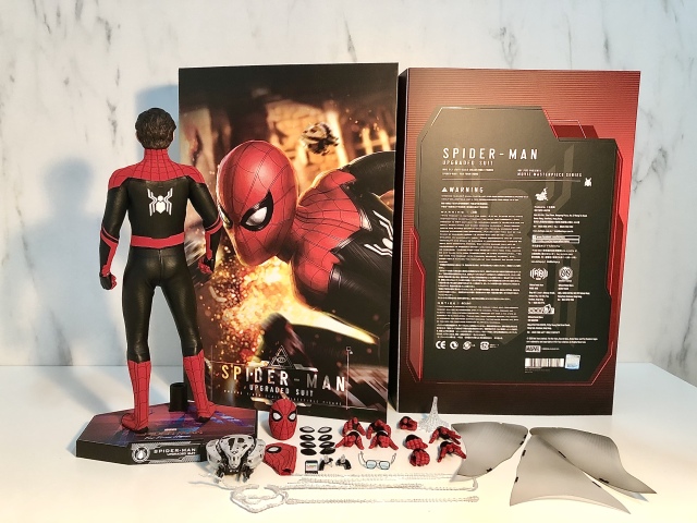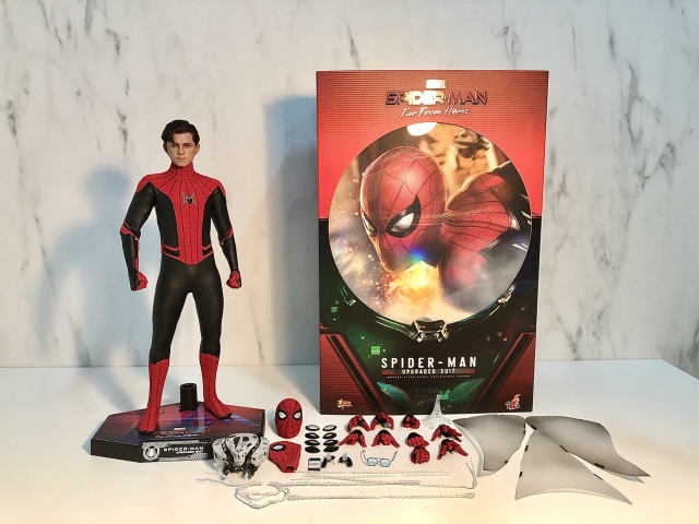 Hot toys mms542 蜘蛛人離家日 升級戰衣離家日系列盒繪設計,都是以神秘客元素來做外盒,從神秘客頭盔裡可以看到內層主角的圖樣,抽開外盒是一個測掀蓋可以欣賞到內盒主體及配件。