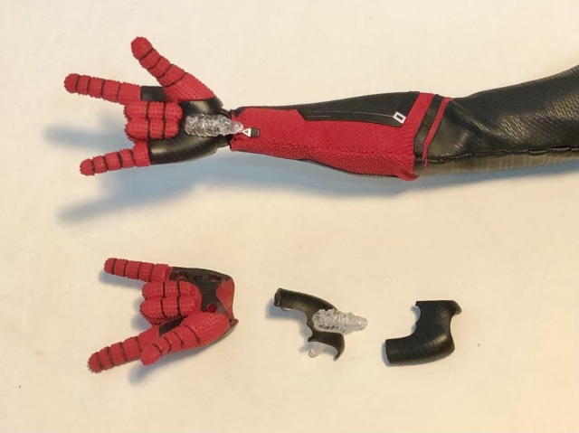 這次配件附上了霍蘭德頭雕/4對替換眼/滑翔翼/數對手型/手機/伊蒂斯墨鏡/縮小無人機/蜘蛛絲組/手掌發射器一對/蜘蛛人頭套/電影主題地台,這次比較特別的是電影設定發射器縮小很多,所以發射蜘蛛絲的手型上設計了一個替換件,來還原這個部分。