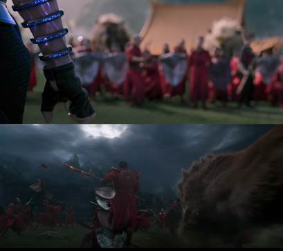 預告可以看到似乎將會帶出一場來自中國古代的戰爭,顯示了「十環」的傳奇其實有非常久遠的一段歷史。就腦補一下吧,出生於古代的文武,在某個宮殿竊走這組來自外星,可以讓自己長生不老的十環,引發了一場大戰。而片中將會看到許多中國傳說的神獸,其中就包括我們熟悉的石獅,在片中將會在這場遠古大戰「活」起來。