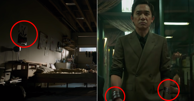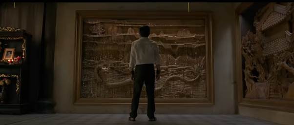 一閃而過的場景其實隱藏龐大的資訊量,其中左邊可以看到一個往生女性的祭壇,也許是尚氣的母親,有人推測母親的死是導致尚氣與姊姊疏離的原因,關鍵等等會提到。而文武面前的這個壁畫,其實可以看到一條龍與十環的樣子,這條龍就是預計會登場的「非凡龍」(Fin Fang Foom)。