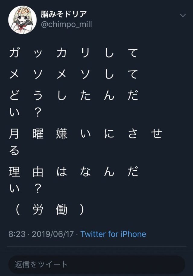 可以看到在第一棒推主的推文中,將原先的第一段歌詞「又是失望、又是哭泣,你怎麼了呢?如太陽般微笑的你在哪裡呢?(がっかりして めそめそして どうしたんだい 太陽みたいに笑う 君はとこだい)」,居然被改成了充滿現實感的「又是失望、又是哭泣,你怎麼了呢?讓你討厭星期一的理由是什麼呢(工作)?」,結果就這樣鬧到一發不可收拾,讓底下網友們也發揮「厭世感」,接起了後面的惡搞歌詞了?!