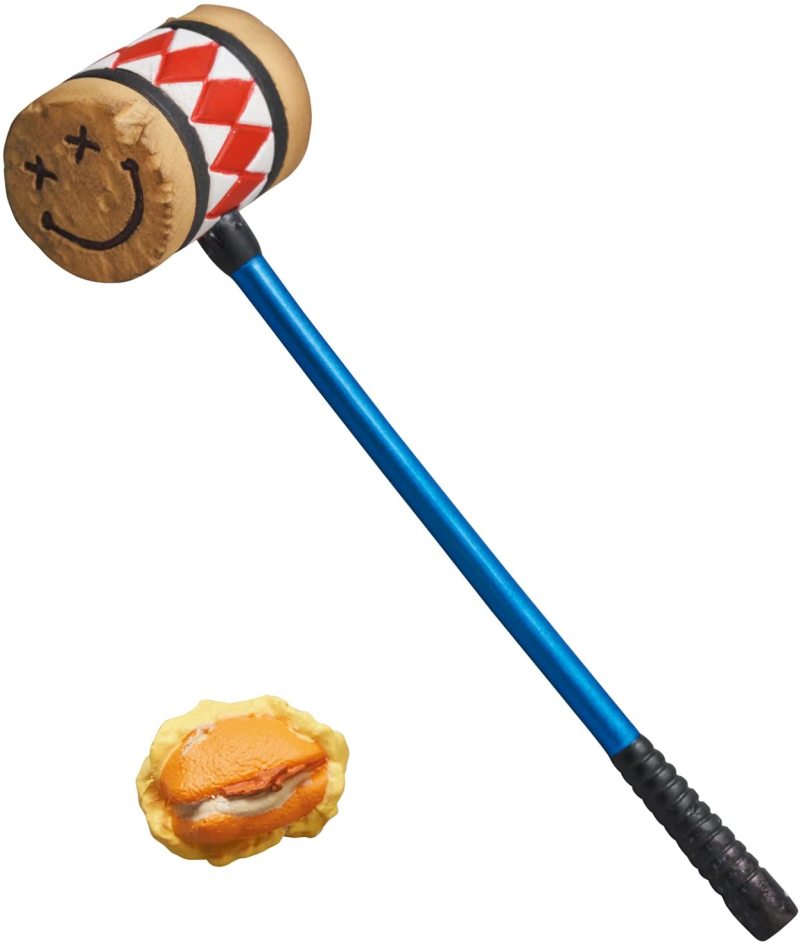 本作高約 15 公分,再現了將外套袖子縫上繽紛流蘇警示膠帶的搶眼造型,不過因為是以硬質材料製成,所以整體看上去實在是相當微妙,不過外套的透明部分倒是有不錯的視覺效果,並還原了金色項鍊、粉紅色小可愛、直條紋牛仔短褲的刷破、大腿的刺青......等細節,頭雕部分小編個人覺得比上一版(點此)有大幅度的進步,眼珠、眼妝都更為自然,還有普通、咬牙兩種表情,配件包含了哈莉超愛的三明治(エッグサンド)、招牌大槌與多個替換手型。