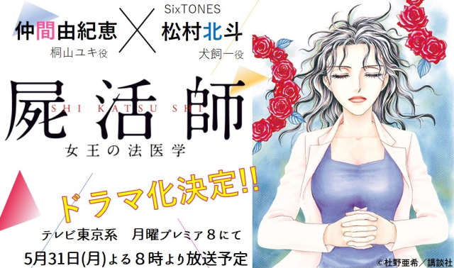 由漫畫家杜野亞希原著的《屍活師~女王的法醫學~》(屍活師女王の法医学)先前於 2013 年拍攝過日劇,於今日 ( 4/27 ) 宣布將再次製作為日劇,找來今年 41 歲的國民女演員仲間由紀惠主演,搭配傑尼斯事務所旗下組合「SixTONES」的松村北斗搭檔演出,將於 2021 年 5 月 31 日於東京電視台播出。