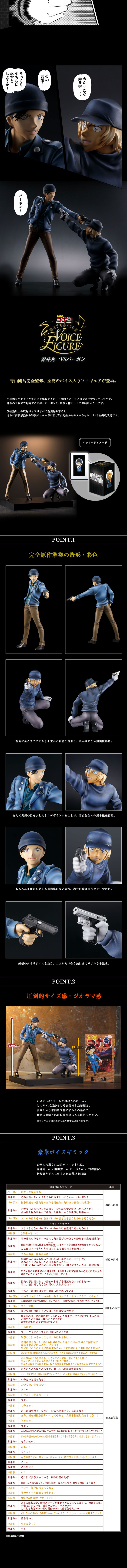 「名偵探柯南 DETECTIVE VOICE FIGURE 赤井秀一VS波本」有聲模型,將劇中經典的名場面立體化!在黑暗組織內當間諜臥底的波本(安室透),為了調查而趁黑夜潛入工藤新一家中,卻早被赤井秀一識破,兩人拔槍互指著對方,陷入對峙的精采一幕!由青山剛昌老師完全監修,徹底還原作畫風與兩人的臉部表情,在赤井秀一的眉毛處更有漫畫般的黑線條,呈現緊張氛圍!