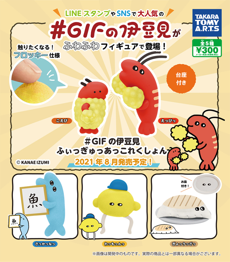 日本玩具公司 TakaraTomy(株式会社タカラトミーアーツ)旗下暢銷熱賣的轉蛋品牌 T-ARTS,日前在官方 twitter 發布了將與人氣插畫家 伊豆見香苗合作,推出過激 LINE 貼圖立體化的「GIFの伊豆見」(暫名)轉蛋!一共有五種款式,一轉參考售價為 300 日圓,預計將於 2021 年 08 月開轉!
