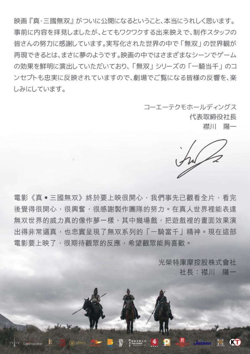 《真三國無雙》原是日本遊戲商光榮特庫摩(KOEI TECMO)旗下的遊戲,以三國演義中的人物為出發點,配合精緻的人物造型及武打動作紅遍全球,熱銷破2100萬份,從PlayStation二代熱賣至今,適逢20週年紀念電影即將上映,「光榮」社長特別寫了一封信祝賀信致贈導演,讚電影完美展現了遊戲中「一騎當千」的精神,也將神奇的遊戲世界成功地搬上大銀幕。