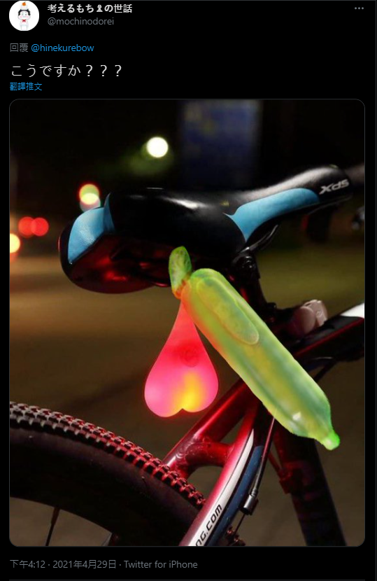 事實上,除了市面上那些閃閃發光的反光貼條外,市面上也有不少令人發笑的警示燈。近日日本商家ひねくれ坊(@hinekurebow)在Twitter上,分享了一則以心型做為造型的腳踏車警示燈商品貼文,此商品不僅可以吊在腳踏車座椅下方,更有著不同顏色來供消費者選擇。