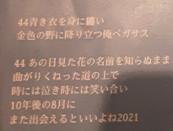 另外44那一看就是《風之谷》的「身穿藍衣,降臨金色原野的我是天馬」、《未聞花名》的「我們仍不知道那天見到的花的名字在彎彎曲曲的道路上時哭時笑如果10年後的8月還能再見面就好了2021」也令人發噱。