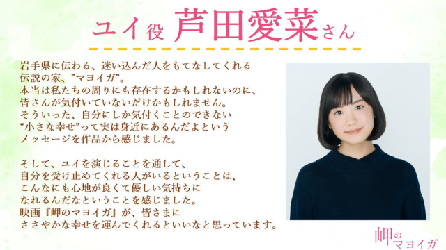 飾演主角的蘆田愛菜表示,這次能擔任《海岬的迷途之家》的配音工作感到十分興奮,劇中的神祕的房子《マヨイガ》是岩手縣的一座傳奇房屋,歡迎那些人生失落的人們,其實它也可能存在在我們的生活之中。