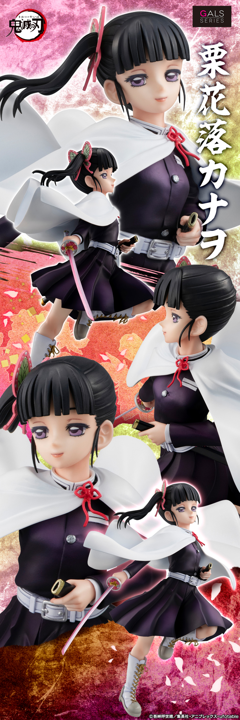 「GALS 栗花落香奈乎」PVC塗裝完成品,尺寸全高約 17 公分,將栗花落香奈乎輕盈拔劍的優雅姿態立體化,臉上淡淡而的微笑表情與迷濛眼神十分迷人,一手握著刀鞘,一手拿著精心刻畫的刀鍔細節的日輪刀,彎起一隻腳的單腳站立姿勢,散發著溫柔又堅強的氣質!鬼殺隊服裝的皺褶、頭上的蝴蝶髮飾與靴子等細節完整呈現;飄逸的披肩與百褶裙襬充滿躍動感。
