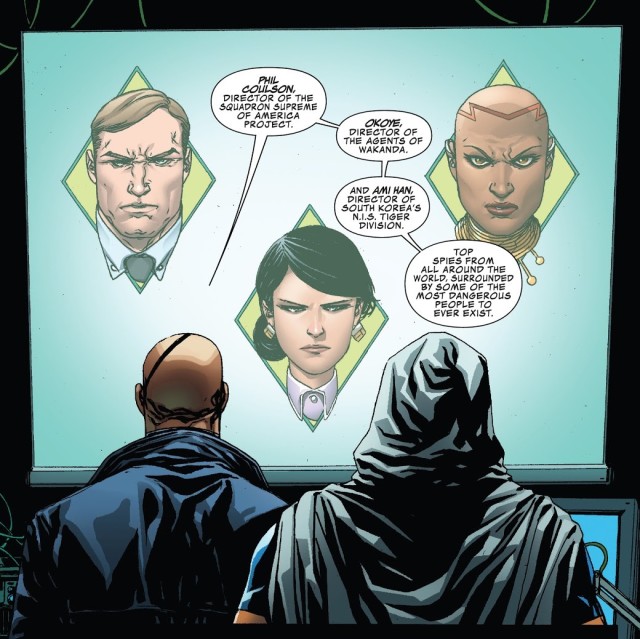 問題在於,這些人並不是什麼小人物,他們都是現今最重要的特務機關們的老大:美國至高中隊(Squadron Supreme of America)的總監菲爾‧考森(Phil Coulson)、韓國虎部門(Tiger Division)的局長韓艾米(Ami Han)以及瓦坎達特工(Agents of Wakanda)隊長奧考耶(Okoye)。為了洗刷自己的汙名,他必須深入險境,完成這些自殺任務才能從黑寡婦手下存活!