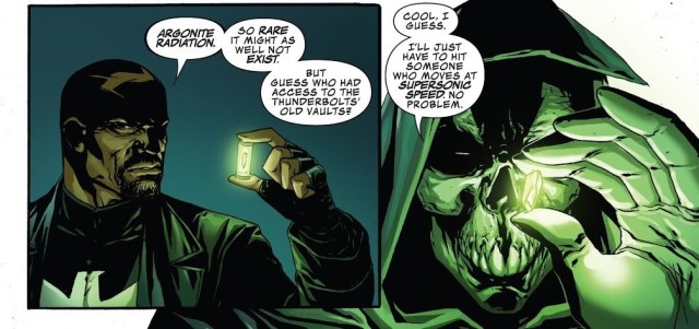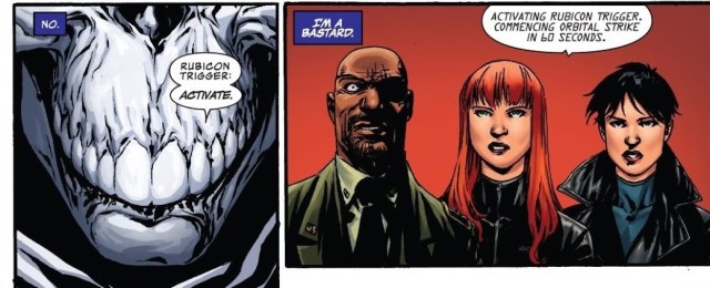 原來「The Rubicon Trigger」是天錘局局長諾曼‧奧斯朋(Norman Osborn,就是蜘蛛人的反派綠惡魔本人!)製造出的終極武器,足以毀滅整個世界。但是他在能夠啟動它之前就失勢了,使得武器去向不明,希爾只找得到操縱介面。