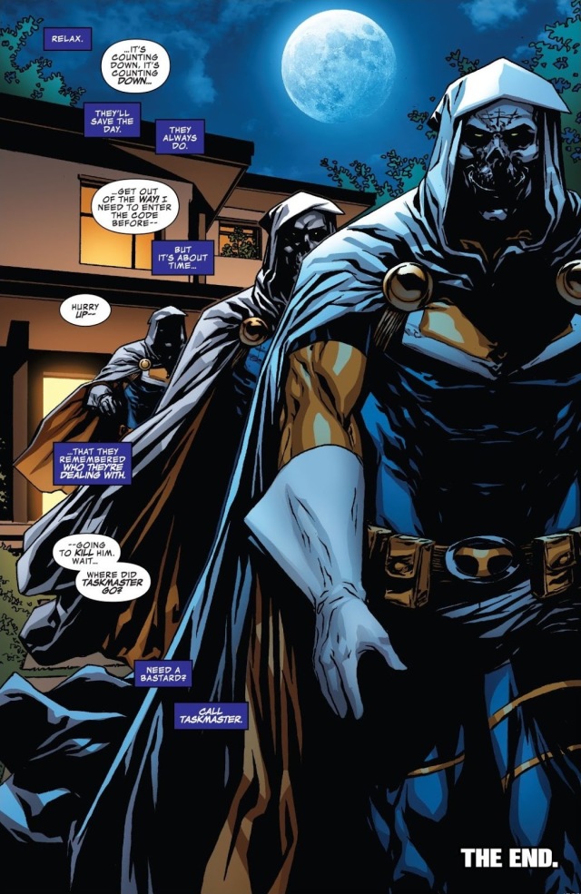這時他原本可以殺死黑寡婦,但是畢竟黑寡婦已經不止一次死裡逃生或是復活,殺死她很可能根本沒用,於是模仿大師留下訊息後再度逃跑。