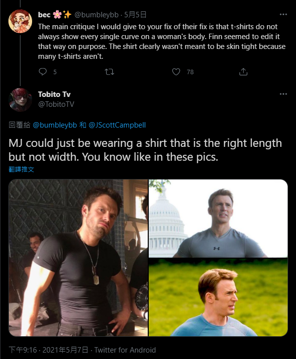 ▼有網友提及「正常衣服不會出現胸部輪廓,可見這是刻意凸顯女性胸部的手法」論點時,也遭另一網友反駁,舉出了凸顯男性肌肉象徵的例子